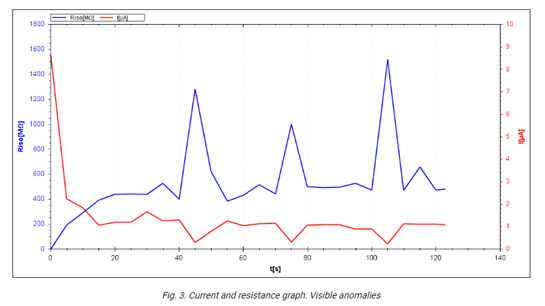 סטאטור המנוע בעוצמה של 40kW/400V הנבדק עבר שיפוץ. לאחר חימום וקירור, בוצעו מדידות. מד בידוד מוגבל/ישן הצביע על טווח יתר במתח בדיקה של 500 V (>300 MΩ). מדידות שנעשו עם מכשיר Sonel MIC-10k1 עם טווח מדידה גבוה יותר הצביעו על ערך התנגדות בידוד של 430 MΩ. עם זאת, מקדם DAR הגיע לערך של 1.2. זה יצר ספק סביר לגבי מצב הבידוד למרות שהתוצאה הייתה הרבה פעמים מעל הסף הנדרש (5 MΩ או ANSI NETA 25 MΩ). מכיוון שהסטטור הותקן במבודדי פורצלן חדשים והוא גם מחומם וייבש, לא נכללה השפעת הלחות האפשרית. צורת גל הזרם וההתנגדות במהלך המדידה מעניינת בנסיבות אלה.
