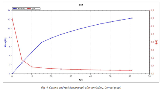 כפי שמוצג בגרף באיור 4, ליפוף מחדש אפשרה להתנגדות הבידוד להגיע ל-12 GΩ (בעבר 430 MΩ) עם עליה נכונה וקבועה בהתנגדות במהלך המדידה, אשר הוצגה גם על ידי מקדם DAR = 2.