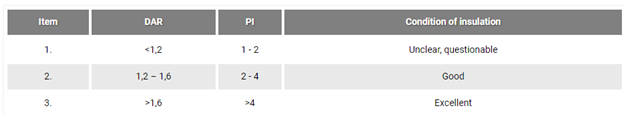 ערכי DAR ו-PI הניתנים בדרך כלל בספרות ועל ידי יצרני ציוד בדיקה להערכת מצב הבידוד ניתנים בטבלה 1.